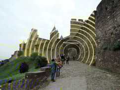 Deux jours avant l'ouverture du nouvel accueil, c'était la panique. L'entrée principale du château était fermée, mais un moment donné, l'autre accès à la Porte Narbonnaise fût aussi bloquée parce qu'un camion qui a enlevé la cabane des caissières restait bloqué ne pouvant pas passer sous la Porte Narbonnaise!